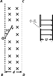 如圖所示,在空間中存在垂直紙面向里的場強為B勻強磁場,其邊界AB、CD的寬度為d,在左邊界的Q點處有一質(zhì)量為m,帶電量為負q的粒子沿與左邊界成30°的方向射入磁場,粒子重力不計.求:
