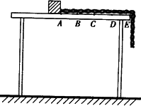長為6 L質(zhì)量為6 m的勻質(zhì)繩,置于特制的水平桌面上,繩的一端懸垂于桌邊外,另一端系有一個可視為質(zhì)點的質(zhì)量為M的木塊,如圖所示.木塊在AB段與桌面無摩擦,在BE段與桌面有摩擦,勻質(zhì)繩與桌面的摩擦可忽略.初始時刻用手按住木塊使其停在A處,繩處于繃緊狀態(tài),AB=BC=CD=DE=L,放手后,木塊最終停在C處.桌面距地面高度大于6 L.