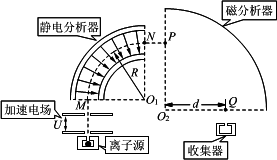 有一種質(zhì)譜儀的工作原理圖如圖所示,加速電場(chǎng)的電壓為U,靜電分析器中有會(huì)聚電場(chǎng),即與圓心O1等距各點(diǎn)的電場(chǎng)強(qiáng)度大小相同,方向沿徑向指向圓心O1.磁分析器中以O(shè)2為圓心、圓心角為90°的扇形區(qū)域內(nèi),分布著方向垂直于紙面的勻強(qiáng)磁場(chǎng),其左邊界與靜電分析器的右邊界平行.由離子源發(fā)出一個(gè)質(zhì)量為m、電荷量為q的正離子(初速度為零,重力不計(jì)),經(jīng)加速電場(chǎng)加速后,從M點(diǎn)沿垂直于該點(diǎn)的電場(chǎng)方向進(jìn)入靜電分析器,在靜電分析器中,離子沿半徑為R的四分之一圓弧軌道做勻速圓周運(yùn)動(dòng),并從N點(diǎn)射出靜電分析器.而后離子由P點(diǎn)沿著既垂直于磁分析器的左邊界,又垂直于磁場(chǎng)方向射入磁分析器中,最后離子沿垂直于磁分析器下邊界的方向從Q點(diǎn)射出,并進(jìn)入收集器.已知磁分析器中磁場(chǎng)的磁感應(yīng)強(qiáng)度大小為B.