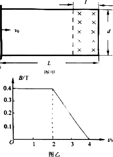 如圖甲所示,在水平面上固定有長為L=2 m、寬為d=1 m的金屬“U”型導軌,在“U”型導軌右側l=0.5 m范圍內存在垂直紙面向里的勻強磁場,其磁感應強度隨時間變化的規(guī)律如圖乙所示.在t=0時刻,質量為m=0.1 kg的導體棒以v0=1 m/s的初速度從導軌的左端開始向右運動,導體棒與導軌之間的動摩擦因數(shù)為μ=0.1,導軌與導體棒單位長度的電阻均為λ=0.2 Ω/m,不計導體棒與導軌之間的接觸電阻及地球磁場的影響.求: