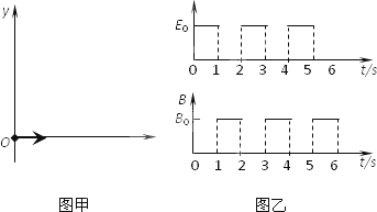 如圖甲所示,在光滑絕緣的水平桌面上建立一xoy坐標(biāo)系,平面處在周期性變化的電場(chǎng)和磁場(chǎng)中,電場(chǎng)和磁場(chǎng)的變化規(guī)律如圖乙所示(規(guī)定沿+y方向?yàn)殡妶?chǎng)強(qiáng)度的正方向,豎直向下為磁感應(yīng)強(qiáng)度的正方向).在t=0時(shí)刻,一質(zhì)量為10 g、電荷量為0.1 C的帶電金屬小球自坐標(biāo)原點(diǎn)O處,以v0=2 m/s的速度沿x軸正方向射出.已知E0=0.2 N/C、B0=0.2 πT.求: