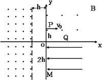 質(zhì)量為m、電量為q的帶電離子從P(0,h)點(diǎn)沿x軸正方向射入第一象限的勻強(qiáng)磁場中,磁感應(yīng)強(qiáng)度為B,并沿著y軸負(fù)方向垂直進(jìn)入勻強(qiáng)電場(電場方向沿x軸負(fù)方向),然后離子經(jīng)過y軸上的M(0,-2h)點(diǎn),進(jìn)入寬度為h的無場區(qū)域,如圖所示,再進(jìn)入另一范圍足夠大的勻強(qiáng)磁場,最后回到P點(diǎn).不計(jì)重力,試求: