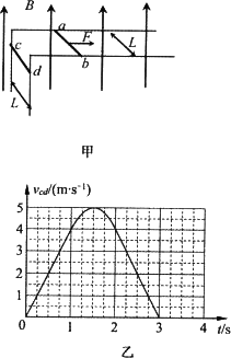 兩根相距L=0.5 m的足夠長的金屬導(dǎo)軌如圖甲所示放置,他們各有一邊在同一水平面上,另一邊垂直于水平面.金屬細(xì)桿ab、cd的質(zhì)量均為m=50 g,電阻均為R=1.0 Ω,它們與導(dǎo)軌垂直接觸形成閉合回路,桿與導(dǎo)軌之間的動摩擦因數(shù)μ=0.5,導(dǎo)軌電阻不計(jì).整個裝置處于磁感應(yīng)強(qiáng)度大小B=1.0 T、方向豎直向上的勻強(qiáng)磁場中.當(dāng)ab桿在平行于水平導(dǎo)軌的拉力F作用下沿導(dǎo)軌向右運(yùn)動時,從某一時刻開始釋放cd桿,并且開始計(jì)時,cd桿運(yùn)動速度vcd隨時間變化的圖像如圖乙所示(在0~1.0 s和2.0~3.0 s內(nèi),cd做勻變速直線運(yùn)動).