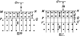 如圖甲所示,空間分布著有理想邊界的勻強(qiáng)電場(chǎng)和勻強(qiáng)磁場(chǎng).勻強(qiáng)磁場(chǎng)分為Ⅰ、Ⅱ兩個(gè)區(qū)域,其邊界為MN、PQ,磁感應(yīng)強(qiáng)度大小均為B,方向如圖所示,Ⅰ區(qū)域高度為d,Ⅱ區(qū)域的高度足夠大.一個(gè)質(zhì)量為m、電量為q的帶正電的小球從磁場(chǎng)上方的O點(diǎn)由靜止開始下落,進(jìn)入電、磁復(fù)合場(chǎng)后,恰能做勻速圓周運(yùn)動(dòng).