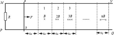 如圖所示,兩平行光滑的金屬導(dǎo)軌MN、PQ固定在水平面上,相距為L(zhǎng),處于豎直向下的磁場(chǎng)中,整個(gè)磁場(chǎng)由n個(gè)寬度皆為x0條形勻強(qiáng)磁場(chǎng)區(qū)域1、2……n組成,從左向右依次排列,磁感應(yīng)強(qiáng)度的大小為B、2B、3B……nB,兩導(dǎo)軌左端MP間接入電阻R,一質(zhì)量為m的金屬棒ab垂直于MN、PQ放在水平軌道上,與導(dǎo)軌電接觸良好,不計(jì)導(dǎo)軌和金屬棒的電阻.