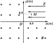 如圖所示,在直角坐標(biāo)系的第I象限分布著場(chǎng)強(qiáng)E=5×103 V/m,方向水平向左的勻強(qiáng)電場(chǎng),其余三象限分布著垂直紙面向里的勻強(qiáng)磁場(chǎng).現(xiàn)從電場(chǎng)中M(0.5,0.5)點(diǎn)由靜止釋放一比荷為q/m=2×104 C/kg不計(jì)重力的帶正電微粒,該微粒第一次進(jìn)入磁場(chǎng)后將垂直通過x軸.