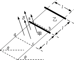 ,導軌間距l,所在平面的正方形區(qū)域abcd內存在有界勻強磁場,磁感應強度為B=0.2 T,方向垂直斜面向上.將甲乙兩電阻阻值相同、質量均為m=0.02 kg的相同金屬桿如圖放置在導軌上,甲金屬桿處在磁場的上邊界,甲乙相距也為l,其中l=0.4 m.靜止釋放兩金屬桿的同時,在甲金屬桿上施加一個沿著導軌的外力F,使甲金屬桿在運動過程中始終做沿導軌向下的勻加速直線運動,加速度大小5 m/s2.(取g=10 m/s2)