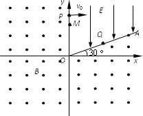 在xoy平面直角坐標系的第Ⅰ象限有射線OA,OA與x軸正方向夾角為30°,如圖所示,OA與y軸所夾區(qū)域存在y軸負方向的勻強電場,其它區(qū)域存在垂直坐標平面向外的勻強磁場;有一帶正電粒子質量m,電量q,從y軸上的P點沿著x軸正方向以v0的初速度射入電場,運動一段時間沿垂直于OA方向經過Q點進入磁場,經磁場偏轉,過y軸正半軸上的M點再次垂直進入勻強電場.已知OP=h,不計粒子的重力.