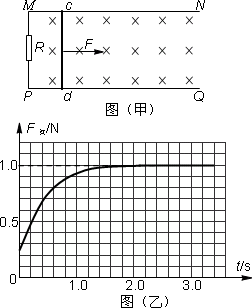 如圖(甲)所示,MN、PQ為水平放置的足夠長的平行光滑導(dǎo)軌,導(dǎo)軌間距L為0.5 m,導(dǎo)軌左端連接一個阻值為2 Ω的定值電阻R,將一根質(zhì)量為0.2 kg的金屬棒cd垂直放置在導(dǎo)軌上,且與導(dǎo)軌接觸良好,金屬棒cd的電阻r=2 Ω,導(dǎo)軌電阻不計,整個裝置處于垂直導(dǎo)軌平面向下的勻強磁場中,磁感應(yīng)強度為B=2 T.若棒以1 m/s的初速度向右運動,同時對棒施加水平向右的拉力F作用,并保持拉力的功率恒為4 W,從此時開始計時,經(jīng)過一定時間t金屬棒的速度穩(wěn)定不變,電阻R中產(chǎn)生的電熱為3.2 J,圖(乙)為安培力與時間的關(guān)系圖像.試求: