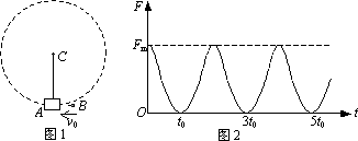 圖1所示為一根豎直懸掛的不可伸長的輕繩,下端栓一小物塊A,上端固定在C點且與一能測量繩的拉力的測力傳感器相連。已知有一質(zhì)量為m0的子彈B沿水平方向以速度v0射入A內(nèi)(未穿透),接著兩者一起繞C點在豎直面內(nèi)做圓周運動。在各種阻力都可忽略的條件下測力傳感器測得繩的拉力F隨時間t的變化關(guān)系如圖2所示。已知子彈射入的時間極短,且圖2中t=0為A、B開始以相同速度運動的時刻。根據(jù)力學(xué)規(guī)律和題中(包括圖)提供的信息,對反映懸掛系統(tǒng)本身性質(zhì)的物理量(例如A的質(zhì)量)及A、B一起運動過程中的守恒量,你能求得哪些定量的結(jié)果?