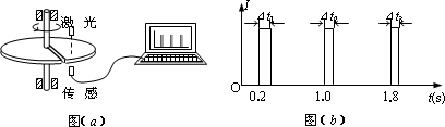一水平放置的圓盤繞豎直固定軸轉(zhuǎn)動.在圓盤上沿半徑開有一條寬度為2mm的均勻狹縫.將激光器與傳感器上下對準,使二者間連線與轉(zhuǎn)軸平行,分別置于圓盤的上下兩側(cè),且可以同步地沿圓盤半徑方向勻速移動,激光器連續(xù)向下發(fā)射激光束.在圓盤轉(zhuǎn)動過程中,當狹縫經(jīng)過激光器與傳感器之間時,傳感器接收到一個激光信號,并將其輸入計算機,經(jīng)處理后畫出相應(yīng)圖線.圖(a)為該裝置示意圖,圖(b)為所接收的光信號隨時間變化的圖線.橫坐標表示時間,縱坐標表示接收到的激光信號強度,圖中Δt1=1.0×10-3s,Δt2=0.8×10-3s.