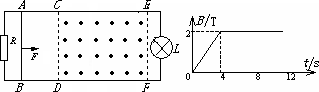 如圖所示,水平面上有兩電阻不計(jì)的光滑金屬導(dǎo)軌平行固定放置,間距d=0.5 m,左端通過導(dǎo)線與阻值為R=2 W 的電阻連接,右端通過導(dǎo)線與阻值為RL=4 W 的小燈泡L連接,在CDEF矩形區(qū)域內(nèi)有豎直向上的勻強(qiáng)磁場(chǎng),CE長為2 m,CDEF區(qū)域內(nèi)磁場(chǎng)的磁感應(yīng)強(qiáng)度B隨時(shí)間變化如圖所示.在t=0時(shí),一阻值為2 W 的金屬棒在恒力F作用下由靜止開始從AB位置沿導(dǎo)軌向右運(yùn)動(dòng),當(dāng)金屬棒從AB位置運(yùn)動(dòng)到EF位置過程中,小燈泡的亮度沒有發(fā)生變化,求: