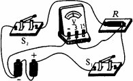 某同學(xué)用一個定值電阻R、兩個開關(guān)、一個電壓表和若干導(dǎo)線連成一個測量電源內(nèi)阻的實驗電路,如圖所示,已知電壓表的內(nèi)阻遠大于電源的內(nèi)電阻,其量程大于電源電動勢,表盤上刻度清晰,但數(shù)字不清,電源內(nèi)阻約為幾歐.