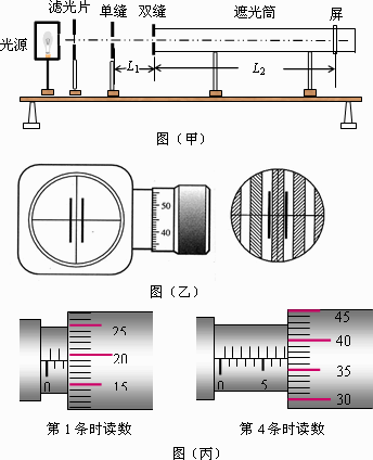 用雙縫干涉測(cè)光的波長(zhǎng).實(shí)驗(yàn)裝置如圖(甲)所示,已知單縫與雙縫間的距離L1=100 mm,雙縫與屏的距離L2=700 mm,雙縫間距d=0.25 mm.用測(cè)量頭來(lái)測(cè)量亮紋中心的距離.測(cè)量頭由分劃板、目鏡、手輪等構(gòu)成,轉(zhuǎn)動(dòng)手輪,使分劃板左右移動(dòng),讓分劃板的中心刻線對(duì)準(zhǔn)亮紋的中心(如圖(乙)所示),記下此時(shí)手輪上的讀數(shù),轉(zhuǎn)動(dòng)測(cè)量頭,使分劃板中心刻線對(duì)準(zhǔn)另一條亮紋的中心,記下此時(shí)手輪上的讀數(shù).