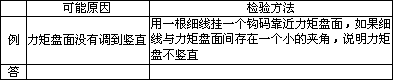 (2)有同學(xué)在做這個實驗時,發(fā)現(xiàn)順時針力矩之和與逆時針力矩之和存在較大差距,檢查發(fā)現(xiàn)讀數(shù)和計算均無差錯,請指出造成這種差距的一個可能原因,并提出簡單的檢驗方法(如例所示,將答案填在下表空格中)