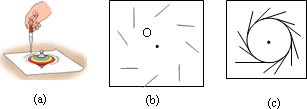 在研究做圓周運動的物體在任意位置的速度方向時,可在桌面上鋪一張白紙,設(shè)法使一個陀螺在紙上O點穩(wěn)定轉(zhuǎn)動,如圖(a)所示,接著在陀螺的邊緣滴幾滴帶顏色的水,水在紙上甩出的痕跡如圖(b)所示,然后再用一張透明膠片做模板,畫一個圓及其幾根切線,如圖(c)所示.