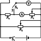 第二步:保持兩滑動(dòng)變阻器的滑動(dòng)頭位置不變,將單刀雙擲開關(guān)S2向2閉合,讀出此時(shí)電壓表和電流表的示數(shù)U2、I2.