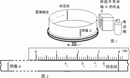 在轉(zhuǎn)臺(tái)開始轉(zhuǎn)動(dòng)達(dá)到穩(wěn)定轉(zhuǎn)速時(shí),向側(cè)面同樣開有狹縫B的紙盒中噴射油漆霧滴,當(dāng)狹縫A轉(zhuǎn)至與狹縫B正對平行時(shí),霧滴便通過狹縫A在紙帶的內(nèi)側(cè)面留下痕跡.改變噴射速度重復(fù)實(shí)驗(yàn),在紙帶上留下一系列的痕跡a、b、c、d.將紙帶從轉(zhuǎn)臺(tái)上取下來,展開平放在刻度尺旁邊,如圖2所示.