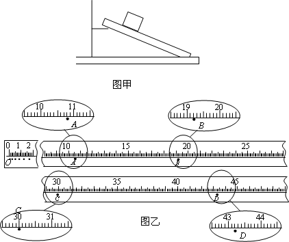 用鐵架臺(tái)將長木板傾斜支在水平桌面上,組成如圖甲所示裝置(示意圖),測量木塊沿斜面下滑的加速度.所提供的儀器有長木板、木塊、打點(diǎn)計(jì)時(shí)器(含紙帶)、學(xué)生電源、米尺、鐵架臺(tái)及導(dǎo)線、開關(guān)等.圖乙是打點(diǎn)計(jì)時(shí)器打出的一條紙帶,紙帶旁還給出了最小刻度為1 mm的刻度尺,刻度尺的零點(diǎn)與O點(diǎn)對齊.打點(diǎn)計(jì)時(shí)器所用交流電源的頻率是50 Hz,相鄰計(jì)數(shù)點(diǎn)間還有四個(gè)打點(diǎn)未標(biāo)出.