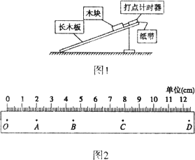 用鐵架臺將長木板傾斜支在水平桌面上,組成如下圖(1)所示裝置(示意圖),測量木塊沿斜面下滑的加速度.所提供的儀器有長木板、木塊、打點計時器(含紙帶)、學(xué)生電源、米尺、鐵架臺及導(dǎo)線、開關(guān)等.圖(2)是打點計時器打出的一條紙帶,紙帶上標(biāo)注了O點和幾個計數(shù)點:A、B、C、D等,相鄰兩個計數(shù)點間還有4個點沒有標(biāo)出,刻度尺的零點與O點對齊.已知打點計時器所用交流電源的頻率是50Hz.