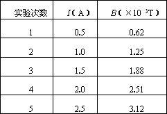 (2)調(diào)節(jié)可變電阻R,多次改變電流并撥動K,得到A中電流I和磁感應強度B的數(shù)據(jù),見下表.由此可得,螺線管A內(nèi)部在感應強度B和電流I的關系為B=________.