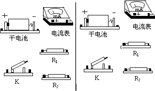 10.0 mA、內(nèi)阻約30 Ω-40 Ω的電流表一個,定值電阻R1=150 Ω,定值電阻R2=100 Ω,單刀單擲開關K,導線若干.要求利用這些器材測量一干電池(電動勢約1.5 V)的電動勢.(1)按要求在實物圖上連線.