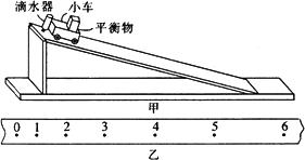 某校研究性學(xué)習(xí)小組的同學(xué)用如圖甲所示的滴水法測(cè)量一小車在斜面上的運(yùn)動(dòng)時(shí)的加速度.實(shí)驗(yàn)過程如下:在斜面上鋪上白紙,用圖釘釘;把滴水計(jì)時(shí)器固定在小車的末端,在上車上固定一平衡物;調(diào)節(jié)滴水計(jì)時(shí)器的滴水速度,使其每0.2 s滴一滴(以滴水計(jì)時(shí)器內(nèi)盛滿水為準(zhǔn));在斜面頂端放置一淺盤,把小車放在斜面頂端,把調(diào)好的滴水計(jì)時(shí)器盛滿水,使水滴能滴入淺盤內(nèi);隨即在撤去淺盤的同時(shí)放開小車,于是水滴在白紙上留下標(biāo)志小車運(yùn)動(dòng)規(guī)律的點(diǎn)跡;小車到達(dá)斜面底端時(shí)立即將小車移開.