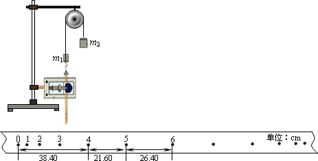 m1、m2組成的系統(tǒng)機(jī)械能守恒.m2從高處由靜止開始下落,m1上拖著的紙帶打出一系列的點(diǎn),對(duì)紙帶上的點(diǎn)跡進(jìn)行測(cè)量,即可驗(yàn)證機(jī)械能守恒定律.下圖給出的是實(shí)驗(yàn)中獲取的一條紙帶:0是打下的第一個(gè)點(diǎn),每相鄰兩計(jì)數(shù)點(diǎn)間還有4個(gè)點(diǎn)(圖中未標(biāo)出),計(jì)數(shù)點(diǎn)間的距離如圖所示.已知m1=50 g、m2=150 g,則(g取10 m/s2,結(jié)果保留兩位有效數(shù)字)①在紙帶上打下記數(shù)點(diǎn)