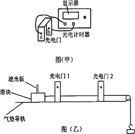 與打點(diǎn)計(jì)時(shí)器一樣,光電計(jì)時(shí)器也是一種研究物體運(yùn)動(dòng)情況時(shí)常用的計(jì)時(shí)儀器,如圖(甲)所示,a、b分別是光電門的激光發(fā)射和接收裝置.現(xiàn)利用如圖(乙)所示的裝置驗(yàn)證“機(jī)械能守恒定律”.方法是:在滑塊上安裝一遮光板,把滑塊放在水平放置的氣墊導(dǎo)軌上,通過跨過定滑輪的細(xì)繩與鉤碼相連,連接好1、2兩個(gè)光電門,在圖示位置釋放滑塊后,光電計(jì)時(shí)器記錄下滑塊上的遮光板先后通過兩個(gè)光電門的時(shí)間分別為△t1、△t2.已知滑塊(含遮光板)質(zhì)量為M、鉤碼質(zhì)量為m、兩光電門間距為s、遮光板寬度為L、當(dāng)?shù)氐闹亓铀俣葹?I>g.