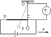 某實驗小組設(shè)計了如圖所示的加速度儀.其中CD是一段水平放置的長為L的、阻值較大的光滑均勻電阻絲,一質(zhì)量和電阻均不計的細長裸金屬絲一端固定于O點,另一端懸掛小球P,無加速度時細金屬絲豎直,恰與電阻絲在C點接觸,OC=H;有向右的加速度時細金屬絲將偏離豎直方向,與電阻絲相交于某一點(如圖中虛線所示,細金屬絲與電阻絲始終保持良好的導(dǎo)電接觸).