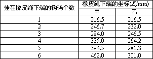 在“探究彈簧彈力大小與伸長(zhǎng)量的關(guān)系”實(shí)驗(yàn)中,甲、乙兩位同學(xué)選用不同的橡皮繩代替彈簧.為測(cè)量橡皮繩的勁度系數(shù),他們?cè)谙鹌だK下端依次逐個(gè)掛上鉤碼(每個(gè)鉤碼的質(zhì)量均為m=0.1 kg,取g=10 m/s2),并記錄繩下端的坐標(biāo)X加i(下標(biāo)i表示掛在繩下端鉤碼個(gè)數(shù)).然后逐個(gè)拿下鉤碼,同樣記錄繩下端的坐標(biāo)X減i,繩下端面坐標(biāo)的值Xi=(X加i+X減i)/2的數(shù)據(jù)如下表: