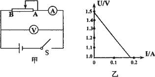 為了測定一節(jié)干電池的電動勢和內(nèi)電阻,某實驗小組按圖甲所示的電路連好實驗電路圖,合上開關(guān),電流表和電壓表的讀數(shù)正常,當將滑動變阻器的滑動觸頭由A端向B端逐漸滑動時,發(fā)現(xiàn)電流表的示數(shù)逐漸增大,而電壓表的示數(shù)接近1.5 V且?guī)缀醪蛔儯钡疆敾瑒佑|頭滑至臨近B端時電壓表的示數(shù)才急劇變化,這種情況很難讀出電壓數(shù)值分布均勻的幾組不同的電流、電壓值,出現(xiàn)上述情況的原因是________;改進的辦法是________;改進后,測出幾組電流、電壓的數(shù)值,并畫出圖像如圖乙所示,由圖像可知,這個電池的電動勢E=________V,內(nèi)電阻r=________Ω.