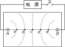 在“用DIS描繪電場的等勢線”實驗中,按圖示連接電路.將電壓傳感器的兩個接線柱分別和兩個探針相連接,已知電壓傳感器正接線柱的電勢高于負接線柱時,讀數(shù)為正.在電極A、B的連線上等距離的取a、b、c、d、e共5個基準點.