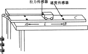 某興趣小組利用拉力傳感器和速度傳感器“驗證動能定理”.如圖.他們將拉力傳感器固定在小車上,用不可伸長的細線將其通過一個定滑輪與鉤碼相連接,用拉力傳感器記錄小車受到拉力的大。谒阶烂嫔舷嗑50.0 cm的A、B兩點各安裝一個速度傳感器,記錄小車通過A、B兩點的速度大。≤囍锌梢苑胖庙来a.