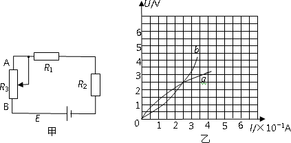 (3)將上述電子元件R1和另一電子元件R2接入如圖所示的電路甲中,它們的伏安特性曲線分別如圖乙中oa、ob所示.電源的電動(dòng)勢(shì)E=6.0 V,內(nèi)阻忽略不計(jì).調(diào)節(jié)滑動(dòng)變阻器R3,使電子元件R1和R2消耗的電功率恰好相等,則此時(shí)電子元件R1的阻值為_(kāi)_______Ω,R3接入電路的阻值為_(kāi)_______Ω(結(jié)果保留兩位有效數(shù)字).