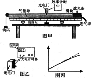 某實(shí)驗(yàn)小組利用如圖甲所示的實(shí)驗(yàn)裝置來(lái)“探究物體運(yùn)動(dòng)的加速度與合外力、質(zhì)量關(guān)系”.光電計(jì)時(shí)器和氣墊導(dǎo)軌是一種研究物體運(yùn)動(dòng)情況的常見(jiàn)儀器,如圖乙所示a、b分別是光電門(mén)的激光發(fā)射和接收裝置.當(dāng)物體從a、b間通過(guò)時(shí),光電計(jì)時(shí)器就可以顯示物體的擋光時(shí)間.實(shí)驗(yàn)前需要調(diào)節(jié)氣墊導(dǎo)軌使之平衡.為了測(cè)量滑塊的加速度a,實(shí)驗(yàn)時(shí)將滑塊從圖示位置由靜止釋放,由數(shù)字計(jì)時(shí)器讀出遮光條通過(guò)光電門(mén)的時(shí)間t,用天平測(cè)鉤碼的質(zhì)量m和滑塊的質(zhì)量M,測(cè)出滑塊上的遮光條初始位置到光電門(mén)的距離L,測(cè)得遮光條的寬度d(d<L).