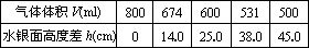 某小組同學(xué)嘗試用下圖所示裝置測(cè)定大氣壓強(qiáng).實(shí)驗(yàn)過(guò)程中溫度保持不變.最初U形管兩臂中的水銀面齊平,燒瓶中無(wú)水.當(dāng)用注射器往燒瓶中注入水時(shí),U形管兩臂中的水銀面出現(xiàn)高度差.實(shí)驗(yàn)的部分?jǐn)?shù)據(jù)記錄在下表中.