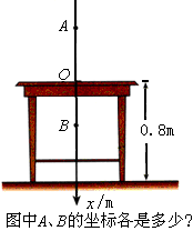 桌面離地面的高度是0.8m,坐標(biāo)系原點定在桌面上,向下方向為坐標(biāo)軸的正方向,如下圖所示。通過測量,確定圖中A、B的坐標(biāo)。_________,_________