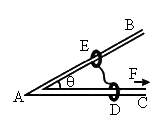 如圖所示,兩輕環(huán)E和D分別套在光滑桿AB和AC上,AB與AC的角為θ,E和D用細(xì)線連接,一恒力F沿AC方向拉環(huán)D,當(dāng)兩環(huán)平衡時(shí),細(xì)線與AC間的夾角為_(kāi)______,細(xì)線的拉力為_(kāi)________.