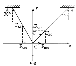 在圖中,用繩AC和BC吊起一個(gè)重50N的物體,兩繩AC、BC與豎直方向的夾角分別為30°和45°,求:繩AC和BC對(duì)物體的拉力的大。