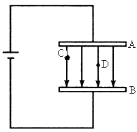如圖所示,金屬板A、B相距30cm,電源電壓為60V,則勻強電場的場強為多少?方向如何?若B板接地,A板電勢為多大?若C點離A板10cm,D點離B板15cm,則C、D兩點電勢差為多大?