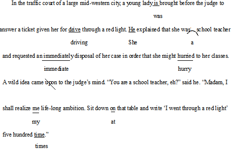 In the traffic court of a large mid-western city, a young lady is brought before the judge to answer a ticket given her for drive through a red light. He explained that she was school teacher and requested an immediately disposal of her case in order that she might hurried to her classes. A wild idea came upon to the judge’s mind. “You are a school teacher, eh?” said he. “Madam, I shall realize me life-long ambition. Sit down on that table and write ‘I went through a red light’ five hundred time.”