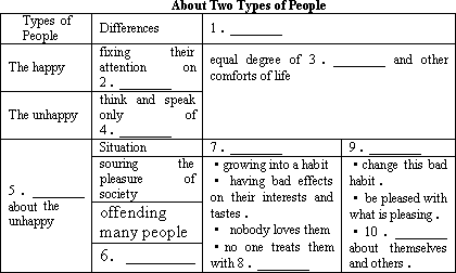 People who are to be happy fix their attention on the convenience of things:the pleasant parts of conversation, the well prepared dishes, the goodness of the wine, the fine weather.They enjoy all the cheerful things.Those who are to be unhappy think and speak only of the opposite things.Therefore, they are continually dissatisfied.By their remarks, they sour the pleasure of society, offend(hurt)many people, and make themselves disagreeable everywhere.If this turn of mind was founded in nature, such unhappy persons would be the more to be pitied.The intention of criticizing and being disliked is perhaps taken up by imitation.It grows into a habit, unknown to its possessors.The habit may be strong, but it may be cured when those who have it realize its bad effects on their interests and tastes.I hope this little warning may be of service to them, and help them change this habit.