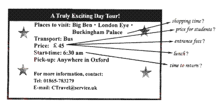 假定你是李華,正在Oxford University參加語言培訓(xùn),計劃做一次the day tour to London;ヂ(lián)網(wǎng)上一則廣告引起了你的注意,但圖中箭頭所指內(nèi)容不清楚,想詢問這些情況。請給該旅行社發(fā)一封電子郵件。