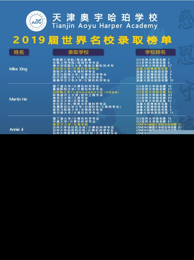 經(jīng)過多年的砥礪奮進(jìn),學(xué)校辦學(xué)成果斐然。我校加拿大高中畢業(yè)率、世界名校錄取率、簽證通過率均達(dá) 100%,人均收獲 7.6份世界名校錄取通知書。學(xué)生憑借出色的成績與優(yōu)秀的素質(zhì),獲得多國頂尖大學(xué)的青睞,多倫多大學(xué)、麥吉爾大學(xué)等世界名校的錄取名單中常有我校學(xué)子的身影。眾多成功案例彰顯了學(xué)校強大的人才培養(yǎng)實力,為莘莘學(xué)子鋪就了堅實的國際升學(xué)之路。
