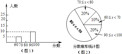 在一次數(shù)學測試之后,小明對本次測試情況進行統(tǒng)計和分析,作出圖1、圖2兩個統(tǒng)計圖,根據(jù)兩個圖的信息完成下列問題.x表示分數(shù).