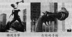 右圖為聯(lián)合國(guó)總部矗立的雕塑——《鑄劍為犁》的照片,它