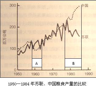 (3)根據(jù)材料二并結(jié)合所學(xué)知識(shí),指出B時(shí)間段中蘇兩國(guó)糧食產(chǎn)量的變化趨勢(shì);并分析不同趨勢(shì)的原因。