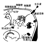 (2)被激活的“激素一受體復(fù)合物”能引起內(nèi)質(zhì)網(wǎng)釋放 Ca2+, Ca2+ 促使細胞內(nèi)的H+ 以 的方式運往細胞外,增加了細胞壁的延展性,使細胞壁對細胞的壓力減小,導(dǎo)致細胞吸水、體積增大而發(fā)生不可逆增長。細胞在生長過程中體積變化最大的細胞器是 。