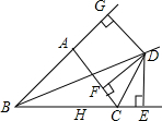 | 如圖,已知BD是∠ABC的內(nèi)角平分線,CD是∠ACB的外角平分線,由D出發(fā),作點D到BC、AC和AB的垂線DE、DF和DG,垂足分別為E、F、G,則DE、DF、DG的關系是( ) |